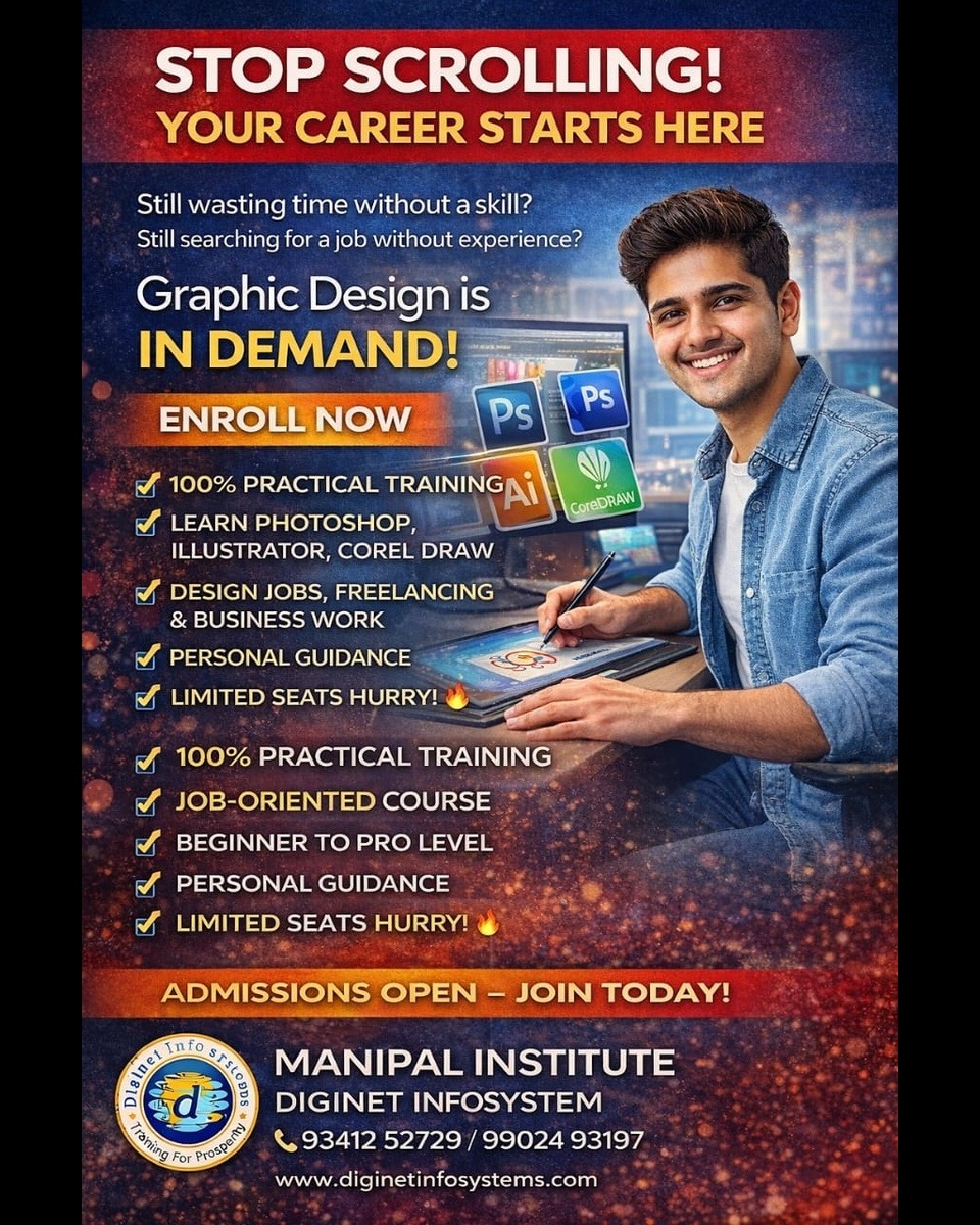 π¨ Stop scrolling. Start building your future. Are you still searching for a job without a practical skill? Do you want a career that combines creativity, technology, and income? Graphic Design is one of the most in-demand skills today, and this course is designed to help you move from beginner to professional with complete hands-on training. At Manipal Institute β Diginet Infosystem, we focus on real skills, real projects, and real career outcomes. What You Will Learn Our Graphic Design course is 100% practical and industry-oriented, covering: β’ Adobe Photoshop β’ Adobe Illustrator β’ CorelDRAW β’ Live practical projects You will learn to design: β’ Posters & banners β’ Logos & branding materials β’ Advertisements β’ Social media creatives β’ Business and marketing designs Why Choose This Course? β 100% Practical Training β Job-Oriented Curriculum β Beginner to Pro Level Learning β Personal Guidance & Mentorship β Suitable for Jobs, Freelancing & Business β Limited Seats for Better Individual Attention We donβt just teach softwareβwe train you to think like a designer and work like a professional. Who Can Join? β’ Students & freshers β’ Job seekers β’ Working professionals β’ Business owners β’ Anyone interested in creative careers No prior design experience required. Admissions Open β Join Today β° Delay means missed opportunities. Start learning a skill that pays for life. π Call / WhatsApp: 93412 52729 | 99024 93197 www.diginetinfosystems.com www.diginetinfosystem.in π₯ Donβt just learn. Earn with your skills.