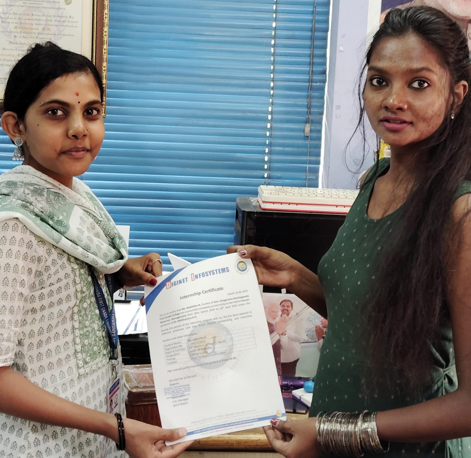 Internship Certificate is proudly awarded to Neetha M P from Smt. Gangamma Hombegowda First Grade College by her HR Shivaranjini at Diginet Infosystems for Successfully Completing 1 month Internship Training under the guidance of Dr.Mallikarjuna K.H. She was hardworking & sincere. We wish her all the best for her future.
