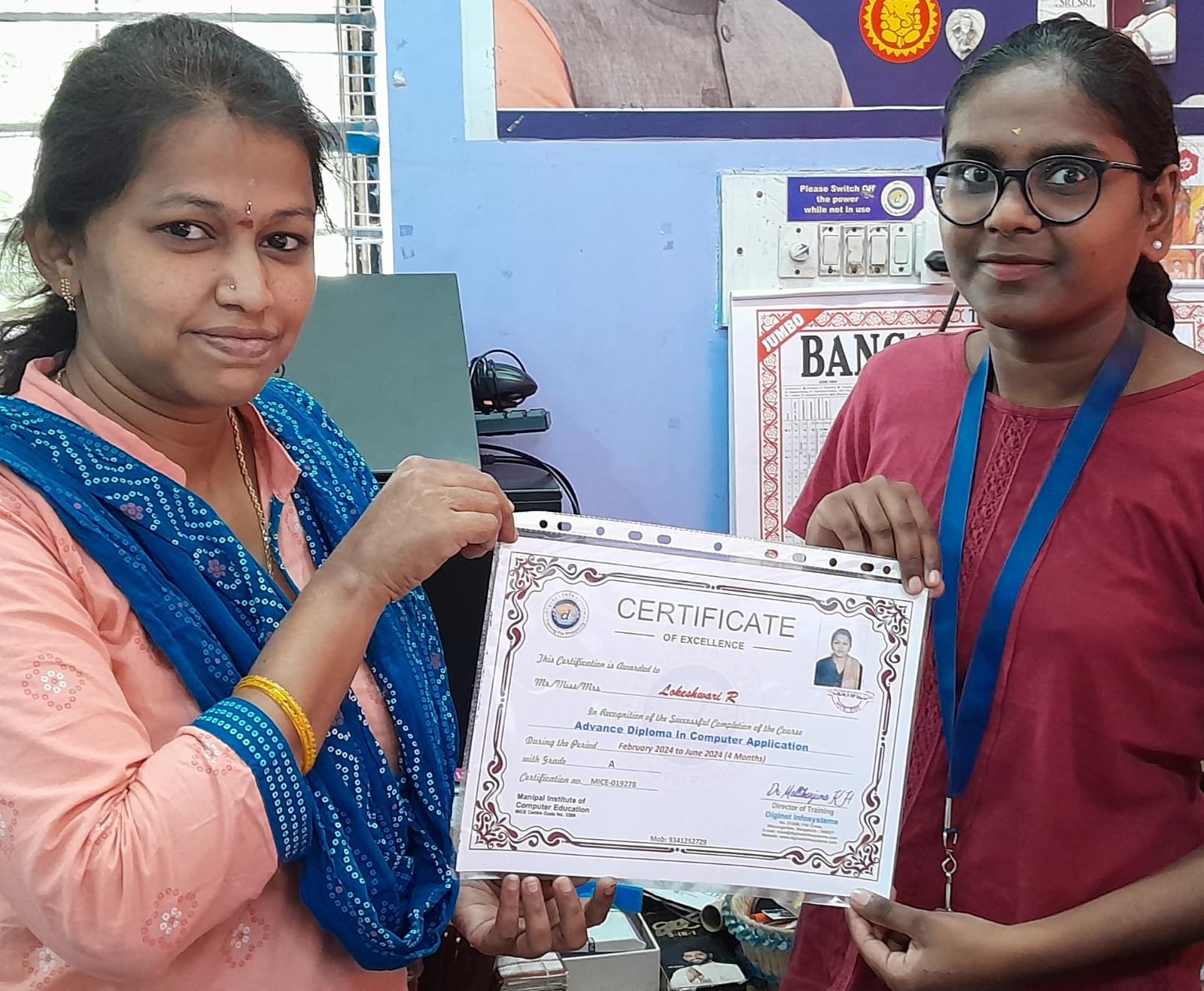 She Course Completion Certificate is proudly awarded to Lokeshwari R a brilliant student For her successful completion of the Course in "Advanced Diploma In Computer Application", at Diginet Infosystems under the teaching of the faculty Vaishanvi Mam and guidance of Centre Manager Dr. Mallikarjuna K.H. For 4 Months. She is found to be hardworking & sincere. We wish her all the best for her future.