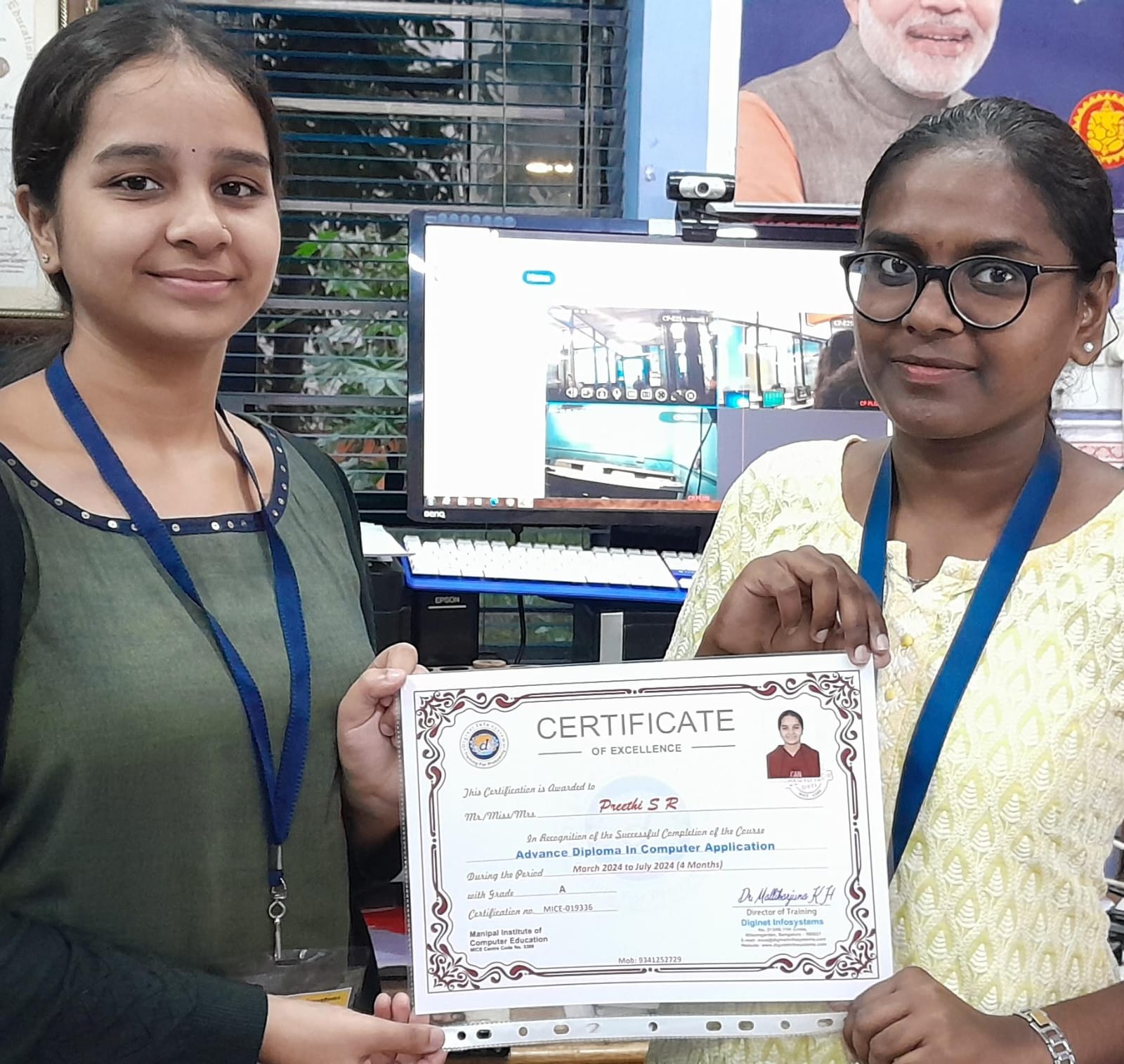She Course Completion Certificate is proudly awarded to Preethi S R a brilliant student for her successful completion of the Course in "Advanced Diploma in Computer Application", at Diginet Infosystems under the teaching of the faculty Vaishnavi Mam and guidance of Centre Manager Dr. Mallikarjuna K.H. For 4 Months. She is found to be hardworking & sincere. We wish her all the best for her future. .