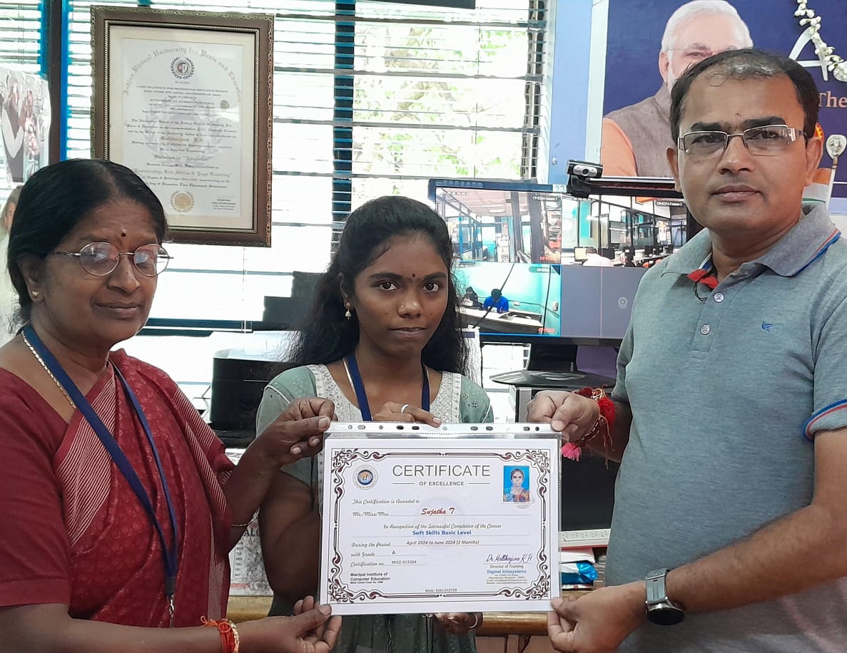 She Course Completion Certificate is proudly awarded to Sujatha T a brilliant student for her successful completion of the Course in "Advanced Diploma in Computer Application", at Diginet Infosystems under the teaching of the faculty Anjali Mam and guidance of Centre Manager Dr. Mallikarjuna K.H. For 4 Months. She is found to be hardworking & sincere. We wish her all the best for her future.
