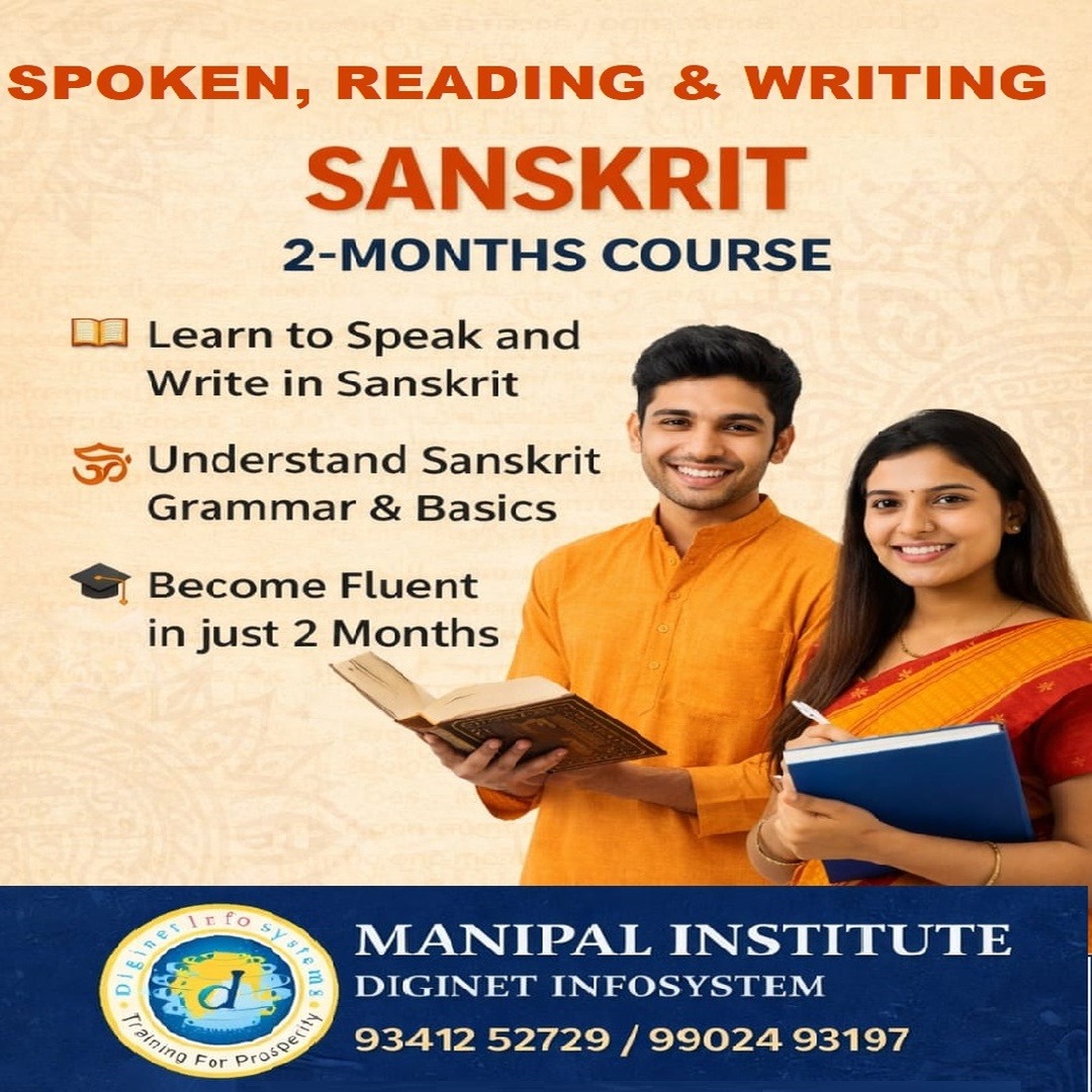 Spoken, Reading & Writing Sanskrit – 2-Month Course Our Spoken, Reading & Writing Sanskrit Course is designed for beginners and learners who wish to understand and communicate in Sanskrit with confidence. This course focuses on practical usage along with strong grammatical foundations, making Sanskrit simple, systematic, and enjoyable to learn. What You Will Learn • Basics of spoken Sanskrit for daily communication • Reading and writing Sanskrit (Devanagari script) • Fundamental Sanskrit grammar and sentence formation • Correct pronunciation and vocabulary building • Understanding simple shlokas and texts • Practical conversation practice for fluency Course Highlights • Beginner-friendly structured curriculum • Focus on spoken Sanskrit along with reading & writing • Experienced faculty guidance • Interactive sessions and regular practice • Fluency development within 2 months Duration • 2 Months Who Can Join • Students • Working professionals • Teachers • Sanskrit enthusiasts • Anyone interested in Indian culture and classical languages This course helps learners gain confidence in Sanskrit and builds a strong foundation for higher studies, teaching, or personal enrichment. 📞 For Enquiries: 93412 52729 / 99024 93197 📍 Institute: Manipal Institute – Diginet Infosystem