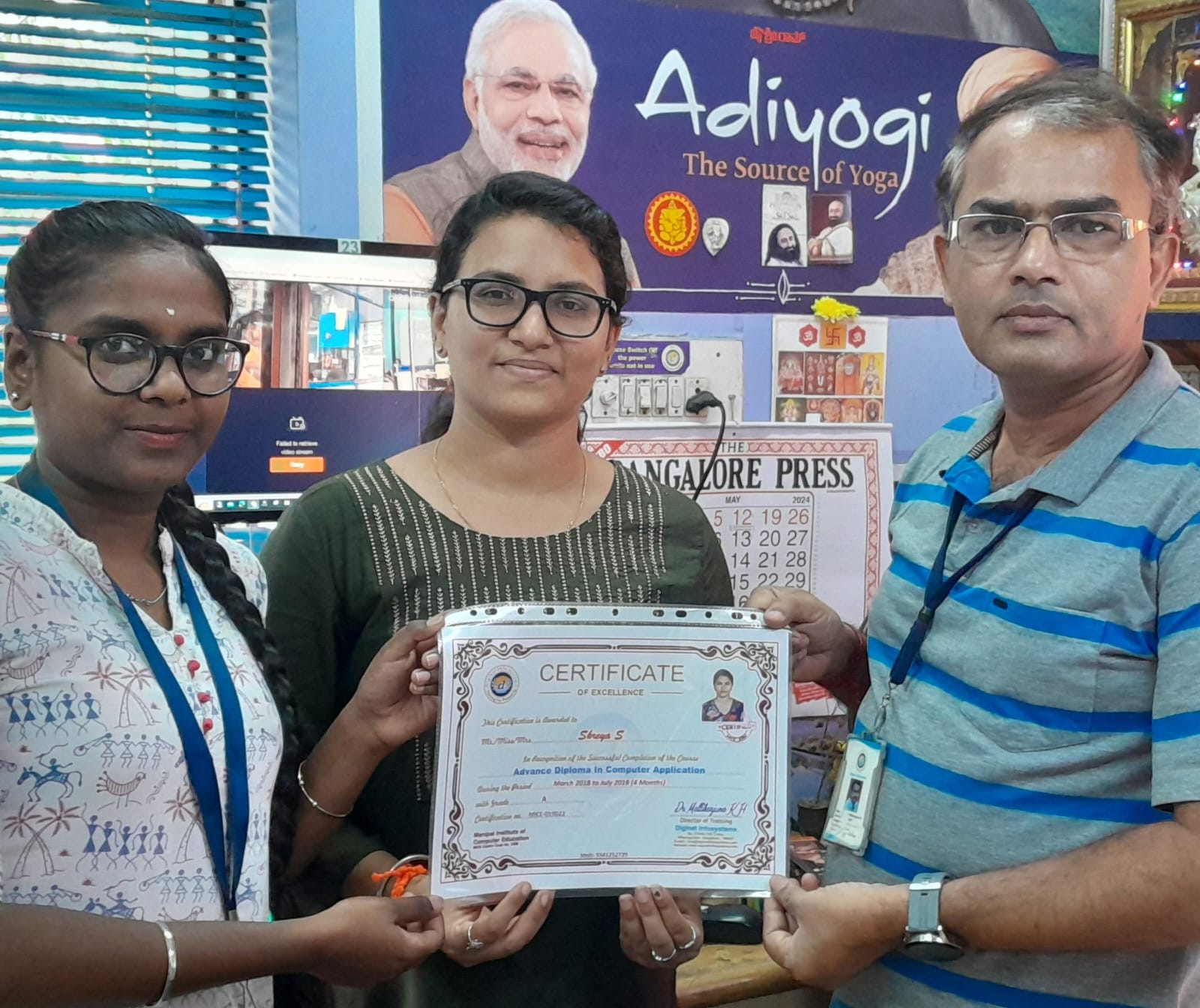 "This Course Completion Certificate is presented with pride to Shreya, an outstanding student, in recognition of her exceptional achievement in completing the 'Advanced Diploma in Computer Application' course at Diginet Infosystems. Throughout the four-month duration, Shreya exhibited remarkable dedication and enthusiasm under the tutelage of the esteemed faculty, Vaishnavi Mam, and with guidance from the distinguished Centre Manager, Dr. Mallikarjuna K.H. Shreya exemplary work ethic and sincerity have been evident throughout her journey. As she sets out to conquer new horizons, we extend our heartfelt wishes for her continued success and prosperity in all her future endeavors. Congratulations, Shreya, on this remarkable accomplishment!"