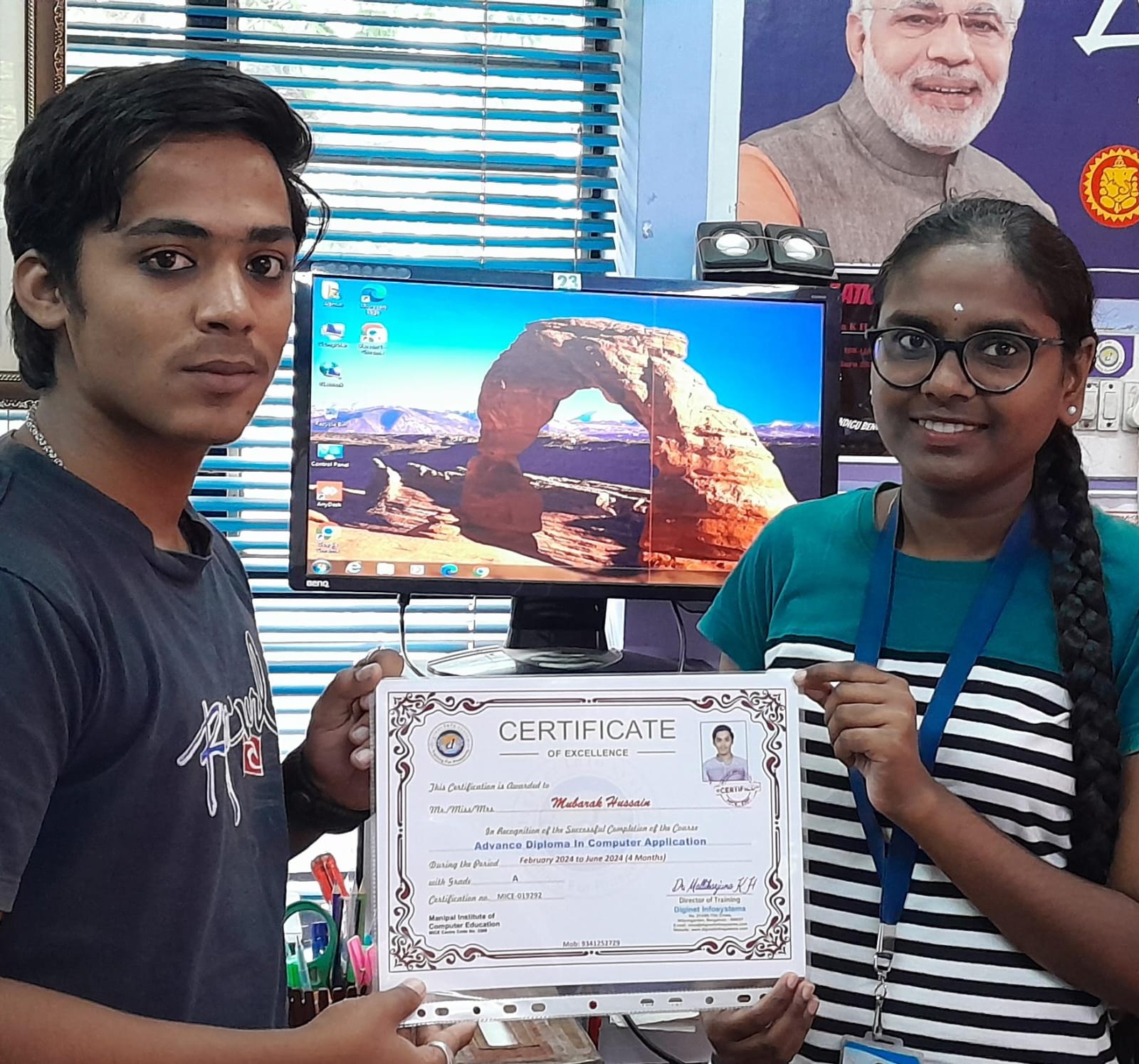 "This Course Completion Certificate is presented with pride to Mubarak Hussain, an outstanding student, in recognition of his exceptional achievement in completing the 'Advanced Diploma in Computer Application' course at Diginet Infosystems. Throughout the four-month duration, Mubarak Hussain exhibited remarkable dedication and enthusiasm under the tutelage of the esteemed faculty, Sabiha Mam, and with guidance from the distinguished Centre Manager, Dr. Mallikarjuna K.H Mubarak Hussain exemplary work ethic and sincerity have been evident throughout his journey. As he sets out to conquer new horizons, we extend our heartfelt wishes for his continued success and prosperity in all his future endeavors. Congratulations, Mubarak Hussain, on this remarkable accomplishment!