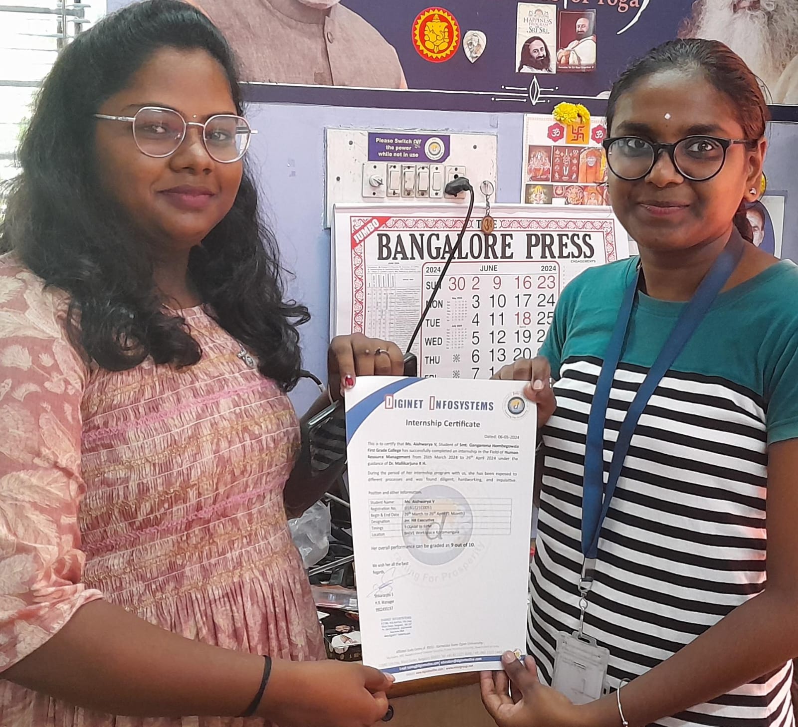 "This Internship Certificate is presented with pride to Ashwariya K, by the HR Department represented by Vaishnavi at Diginet Infosystems, in recognition of her successful completion of a one-month internship program at Smt. Gangamma Hombegowda First Grade College. Throughout her internship, Ashwariya exhibited exceptional dedication and sincerity under the guidance of Dr. Mallikarjuna K.H. Her diligence and hard work have been commendable, reflecting her commitment to professional growth and development. As she ventures into the next phase of her journey, we extend our warmest wishes for a future filled with prosperity and accomplishments. Congratulations, Ashwariya, on this significant milestone!"